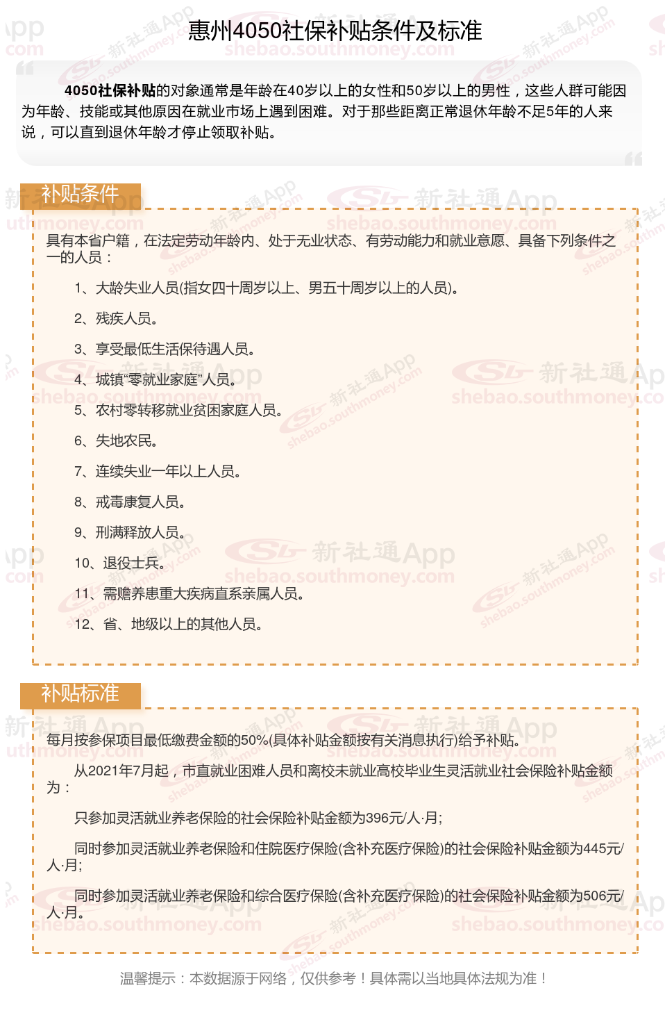 2024惠州4050补贴主要针对的是年龄在40岁以上的女性和50岁以上的男性,这些人群通常因为年龄较大而面临就业困难。