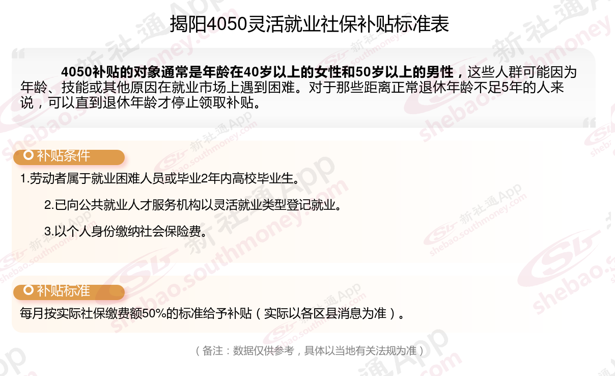 2024揭阳灵活就业4050社保补贴是一项面向特定年龄段的就业困难人群的社会保险补贴。