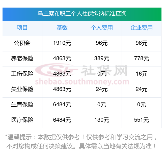2024年乌兰察布社保缴费多少钱?下表是2023-2024年乌兰察布社保费用明细参考,根据新社通app-社保缴费查询工具提供的最新数据如下: