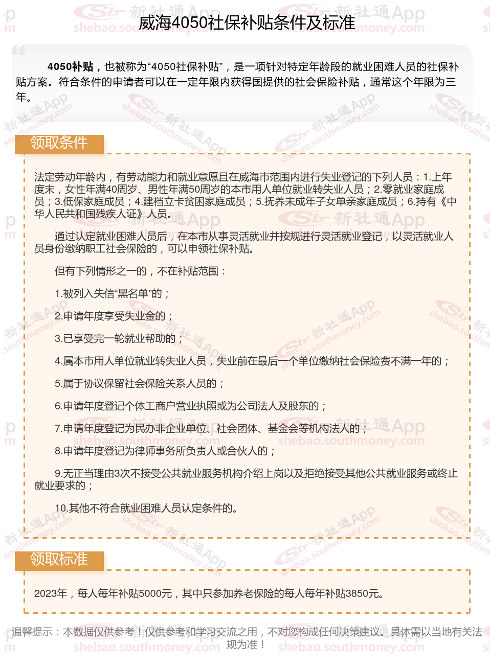 2024威海灵活就业4050社保补贴是一项面向特定年龄段的就业困难人群的社会保险补贴。