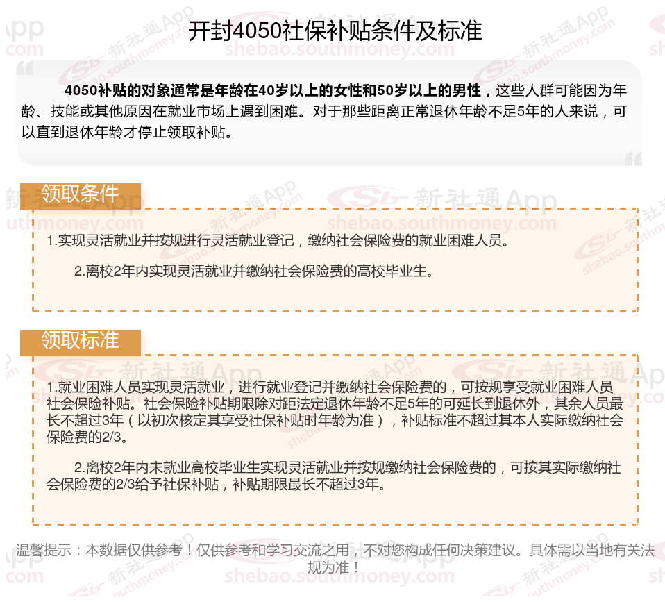 2024开封4050补贴主要针对的是年龄在40岁以上的女性和50岁以上的男性,这些人群通常因为年龄较大而面临就业困难。