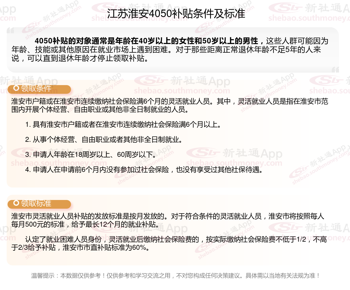 二、2023-2024年江苏淮安4050社保补贴标准及条件,最新如下: