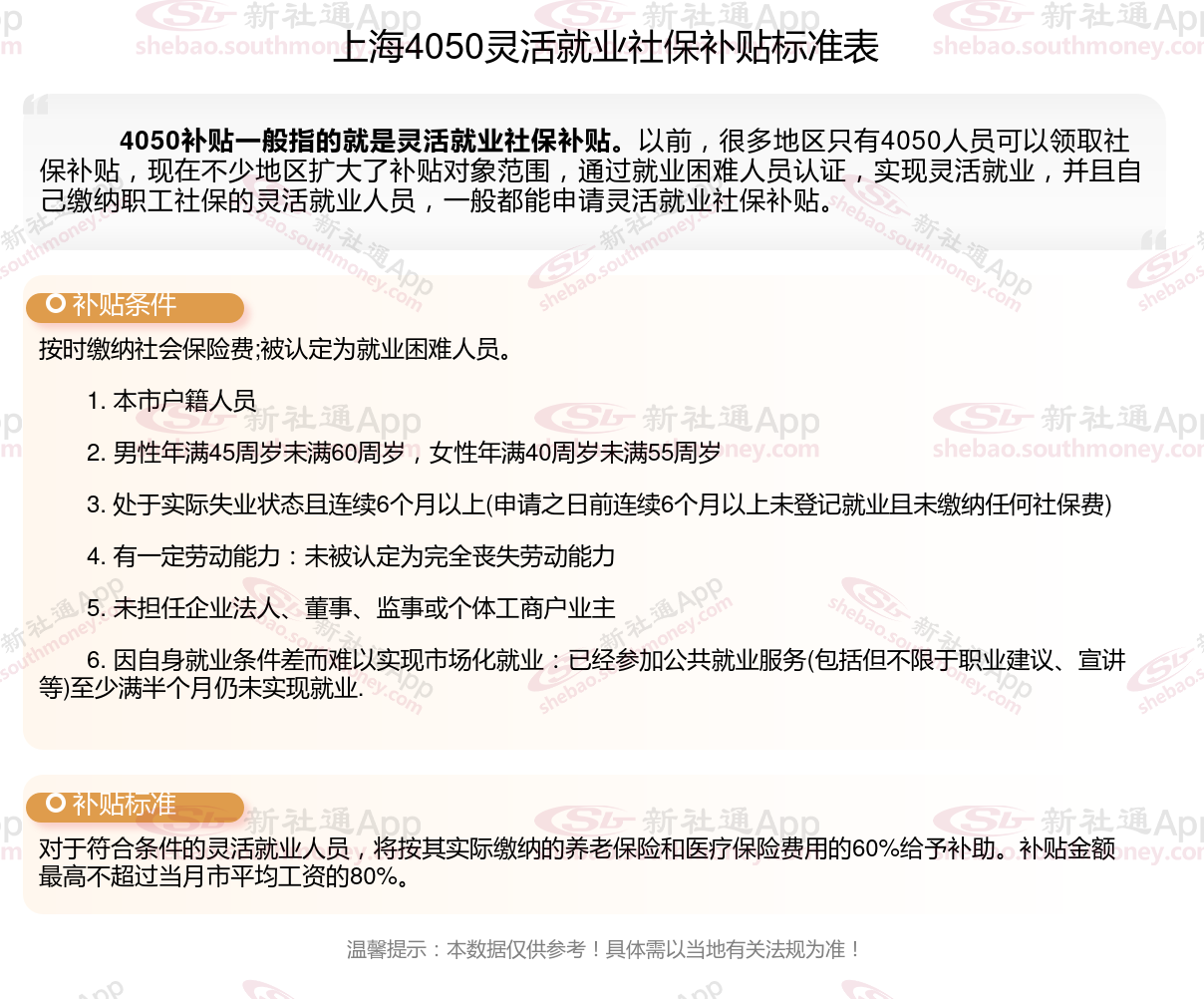 以上就是上海4050灵活就业社保补贴的相关内容,欢迎关注新社通/下载新社通APP了解更多五险一金专业资讯。