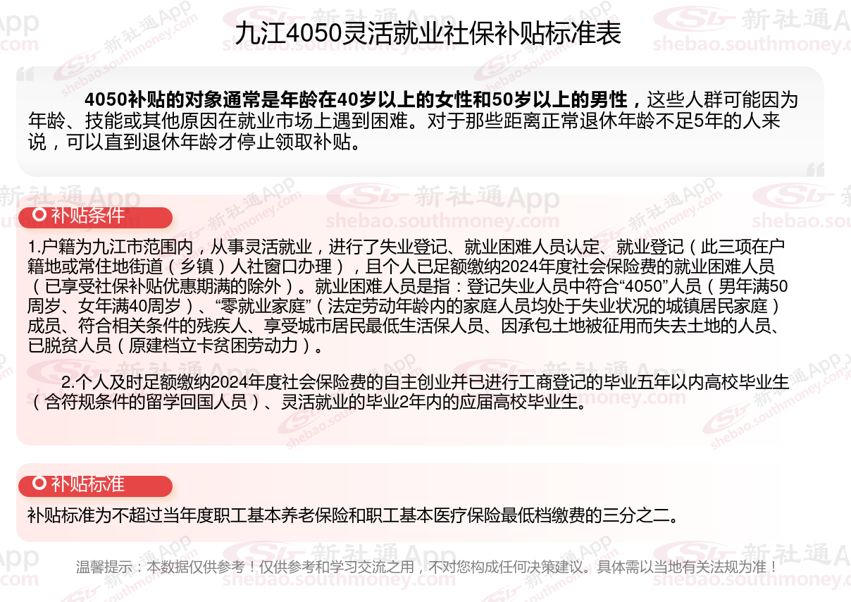 2024九江4050补贴主要针对的是年龄在40岁以上的女性和50岁以上的男性,这些人群通常因为年龄较大而面临就业困难。