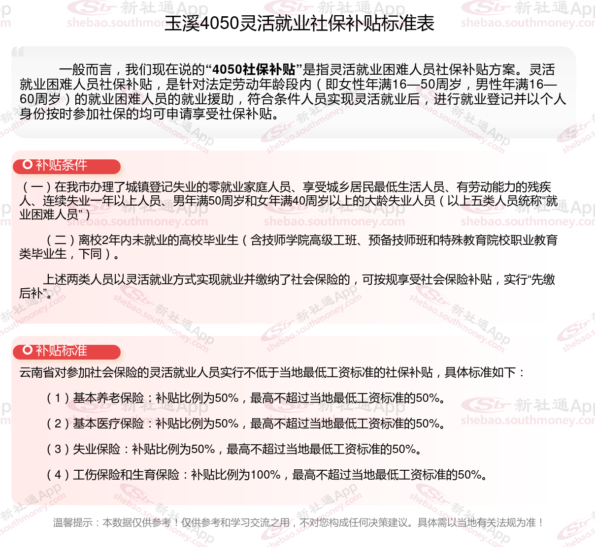 2024玉溪灵活就业4050社保补贴是一项面向特定年龄段的就业困难人群的社会保险补贴。
