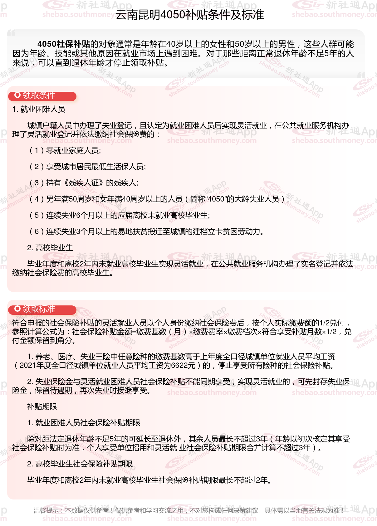 一、云南昆明4050社保补贴标准及条件2023-2024年