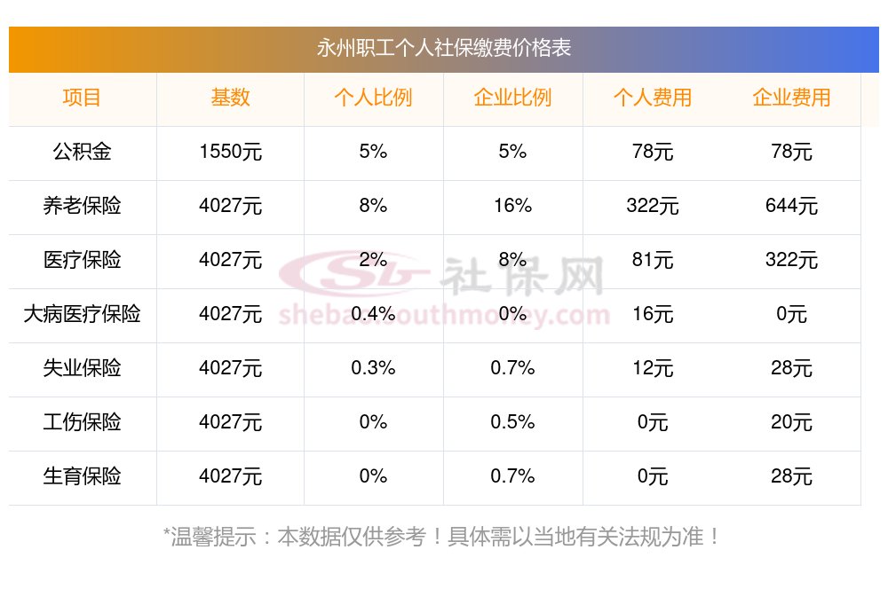 2024年永州社保缴费多少钱?下表是2023-2024年永州社保费用明细参考,如下: