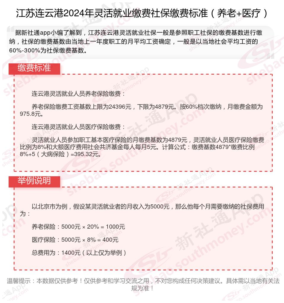一、2024年江苏连云港灵活就业社保缴费标准表 江苏连云港灵活就业社保多少钱一个月?