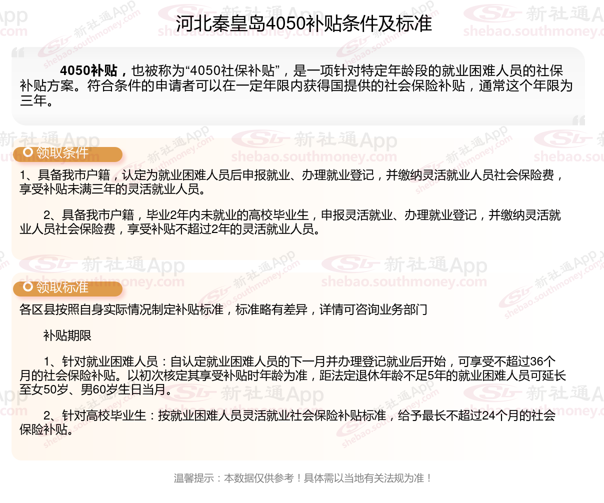 一、河北秦皇岛4050社保补贴标准及条件2023-2024年