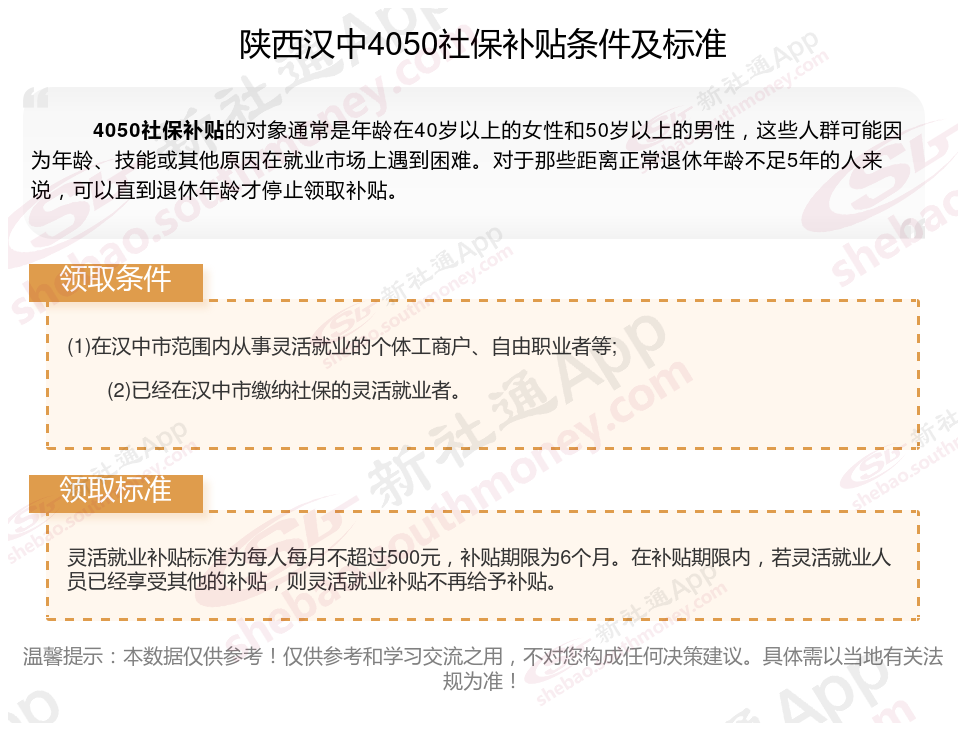 以上就是陕西汉中4050灵活就业社保补贴的相关内容,欢迎关注新社通/下载新社通APP了解更多五险一金专业资讯。