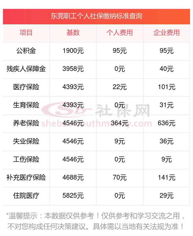 2024年东莞社保缴费多少钱?下表是2023-2024年东莞社保费用明细参考,新社通app-社保缴费查询工具提供的最新数据如下: