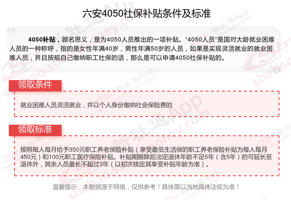“4050人员”是国对大龄就业困难人员的一种称呼,指的是女性年满40岁,男性年满50岁的人员,那么六安4050灵活就业社保补贴标准是多少钱?六安4050社保补贴条件是什么?接下来随新社通APP小编了解一下最新资讯。