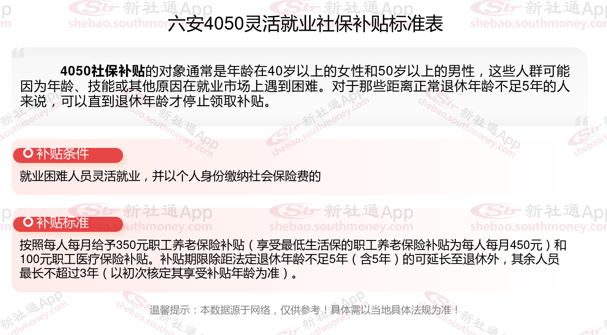 以上就是六安4050灵活就业社保补贴的相关内容,欢迎关注新社通/下载新社通APP了解更多五险一金专业资讯。