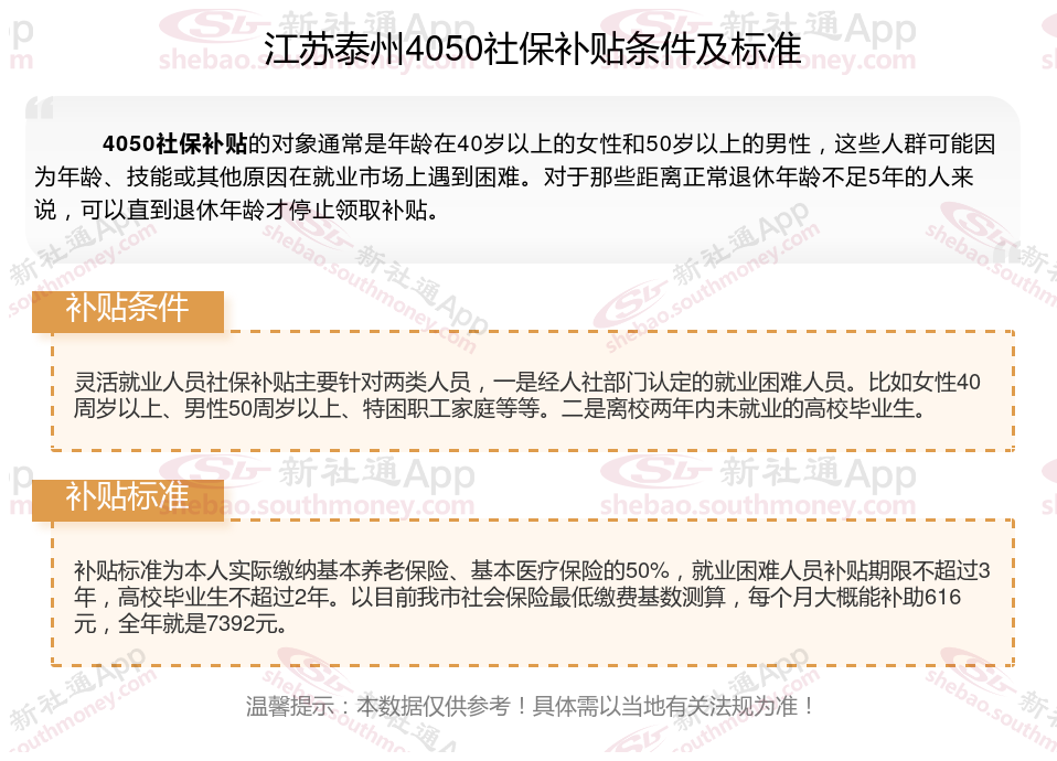 一、2023-2024年江苏泰州灵活就业4050社保补贴标准和条件是什么