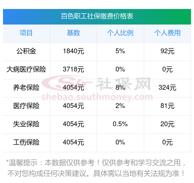 2025年百色社保缴费多少钱?下表是2023-2024年百色社保费用明细参考,新社通app-社保缴费查询工具提供的最新数据如下: