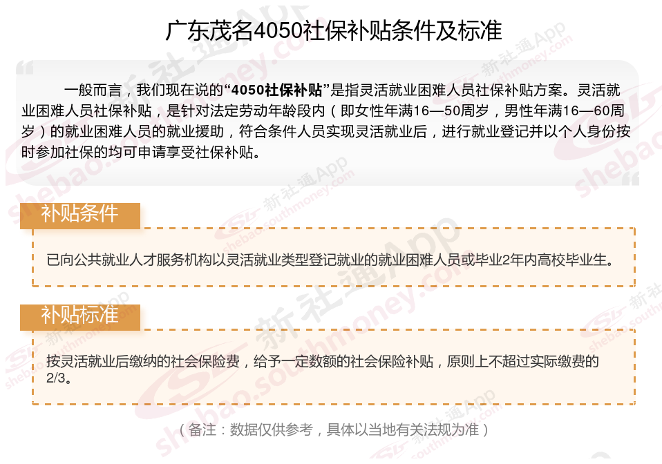 2025广东茂名灵活就业4050社保补贴是一项面向特定年龄段的就业困难人群的社会保险补贴。