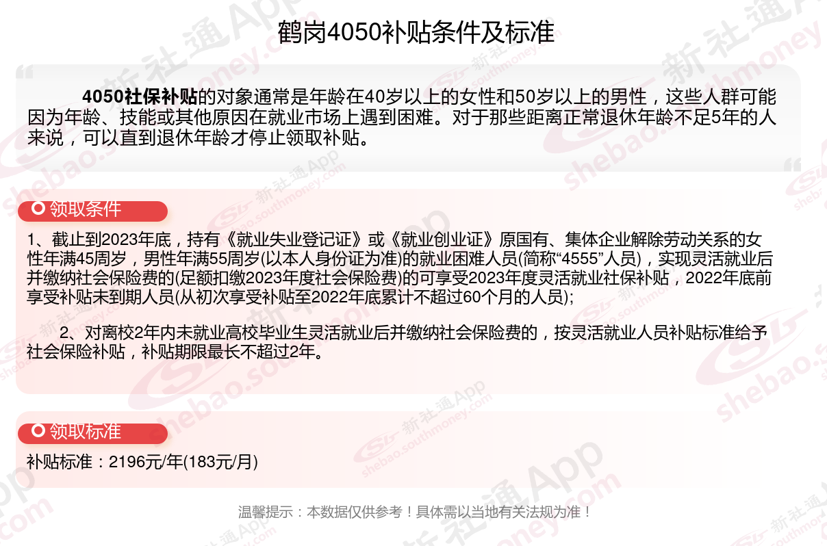 一、鹤岗4050社保补贴标准及条件2023-2024年