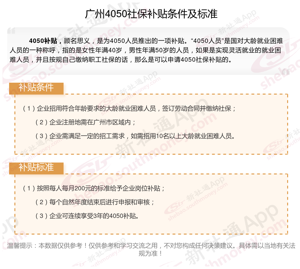 “4050人员”是国对大龄就业困难人员的一种称呼,指的是女性年满40岁,男性年满50岁的人员,那么广州4050灵活就业社保补贴标准是多少钱?广州4050社保补贴条件是什么?接下来随新社通APP小编了解一下最新资讯。