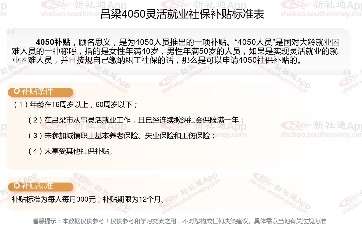 二、吕梁4050社保补贴标准及条件,最新如下: