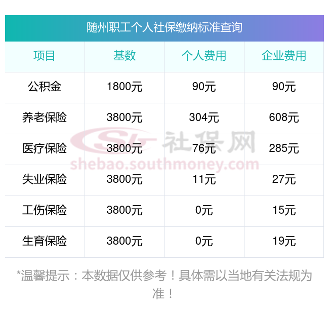 2025年随州社保缴费多少钱?下表是2023-2024年随州社保费用明细参考,如下: