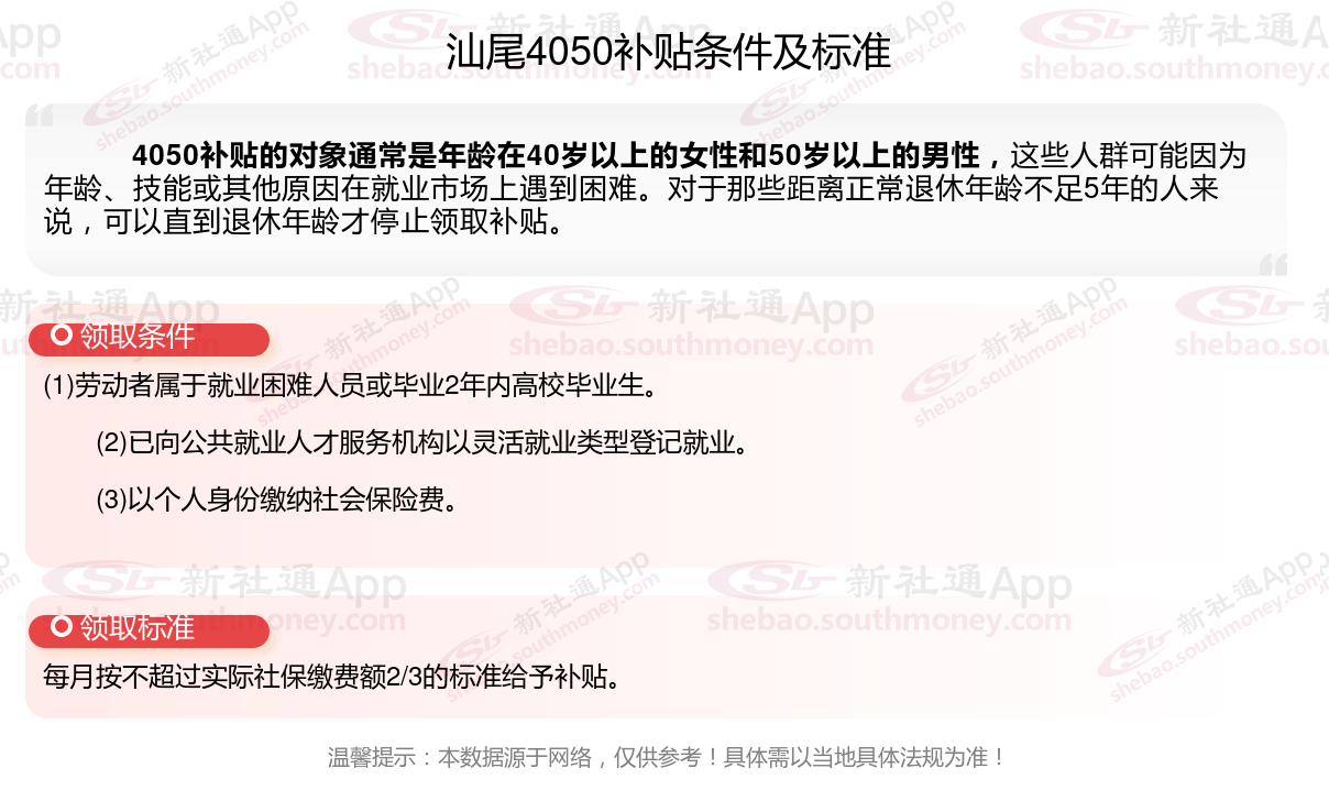 以上就是汕尾4050灵活就业困难人员社保补贴的相关内容,欢迎关注新社通/下载新社通APP了解更多五险一金专业资讯。