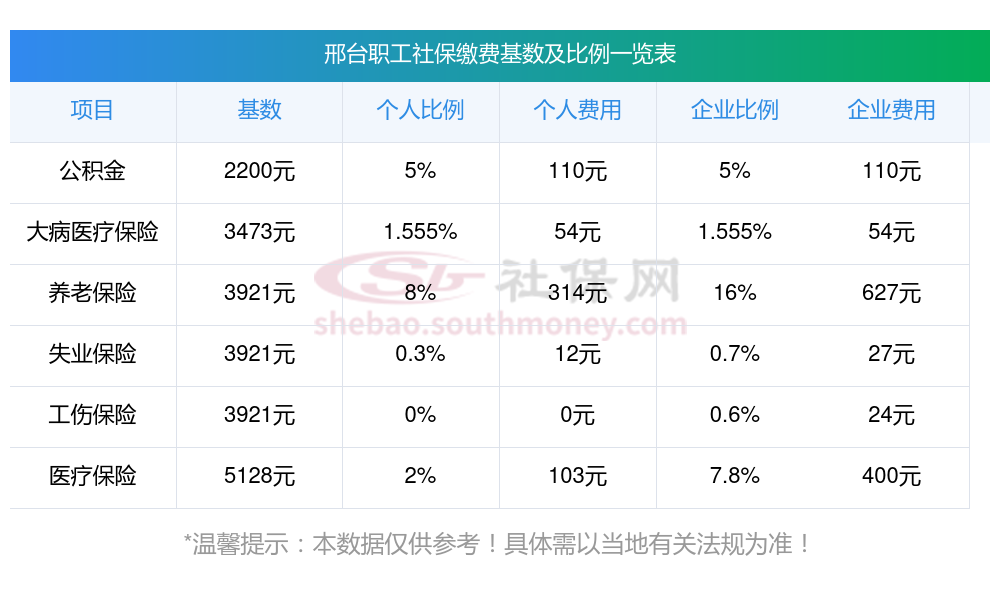 2025年邢台社保缴费多少钱?下表是2023-2024年邢台社保费用明细参考,新社通app-社保缴费查询工具提供的最新数据如下: