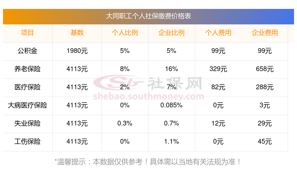 大同社保多少钱一个月?下面和社保网-APP一起来看看2025年大同最低标准社保费用明细参考,新社通app-社保缴费查询工具提供的最新数据如下:
