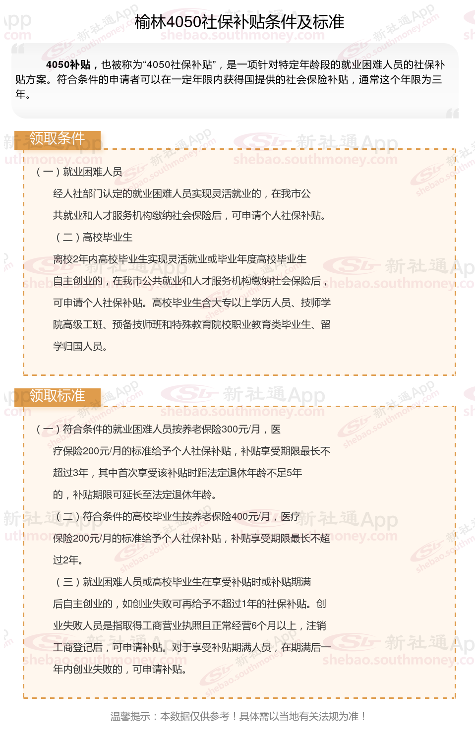 “4050人员”是国对大龄就业困难人员的一种称呼,指的是女性年满40岁,男性年满50岁的人员,那么榆林4050灵活就业社保补贴标准是多少钱?榆林4050社保补贴条件是什么?接下来随新社通APP小编了解一下最新资讯。