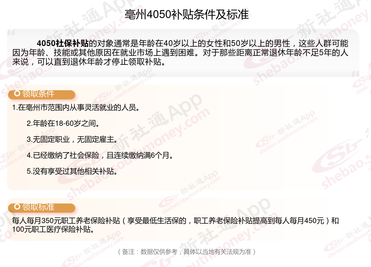 二、亳州4050社保补贴标准及条件,最新如下: