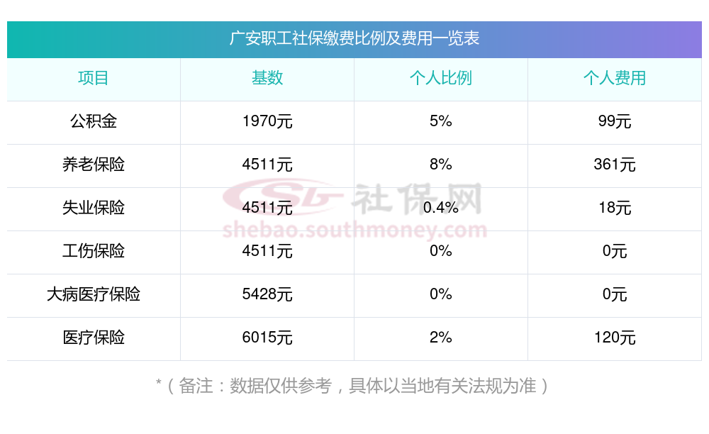 2025年广安社保缴费多少钱?下表是2024-2025年广安社保费用明细参考,新社通app-社保缴费查询工具提供的最新数据如下:
