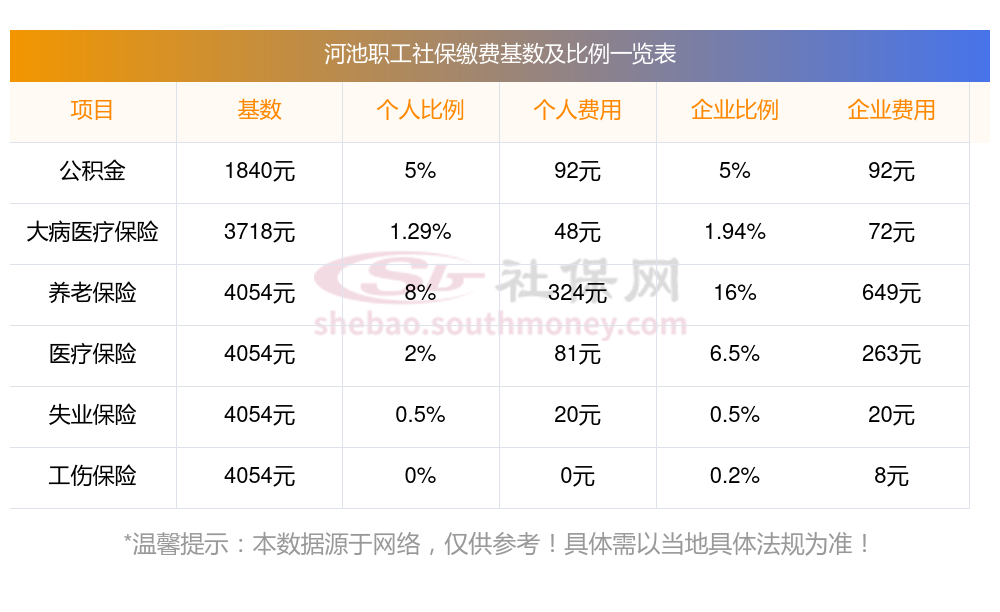 2025年河池社保缴费多少钱?下表是2023-2024年河池社保费用明细参考,如下: