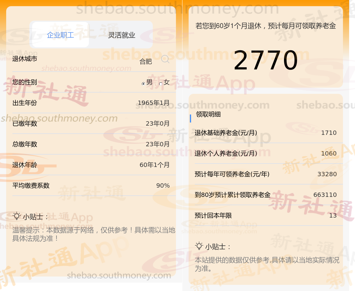 每月可领养老金=基础养老金+个人养老金≈1710+1060≈2770元。
