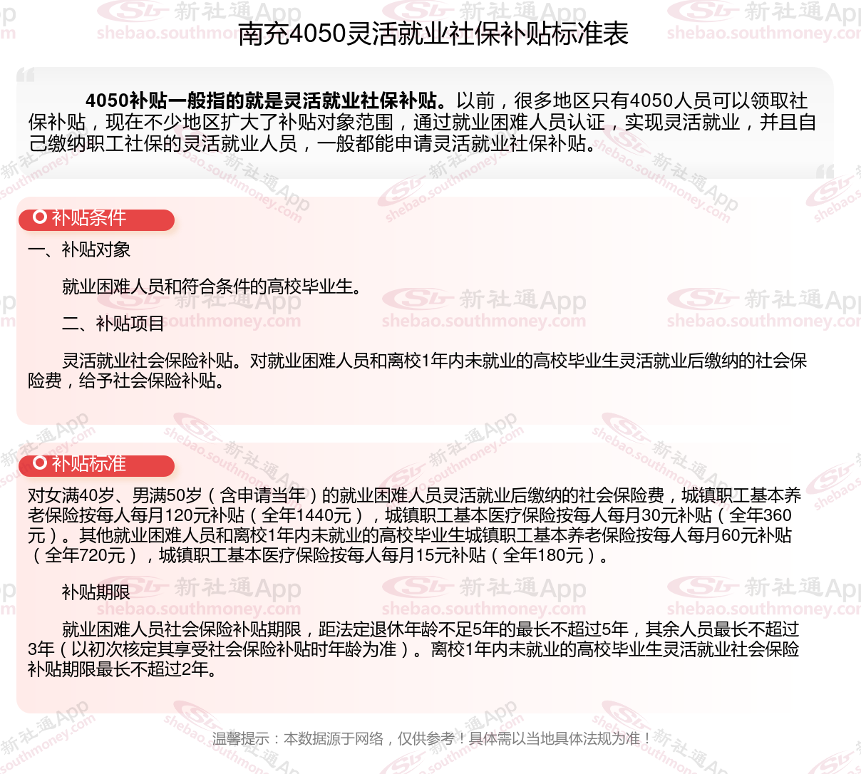2025南充灵活就业4050社保补贴是一项面向特定年龄段的就业困难人群的社会保险补贴。