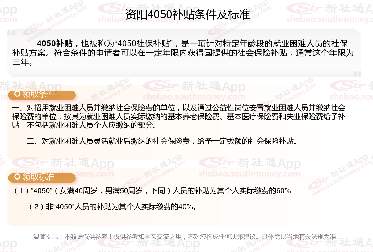 二、2023-2024年资阳4050社保补贴标准及条件,最新如下: