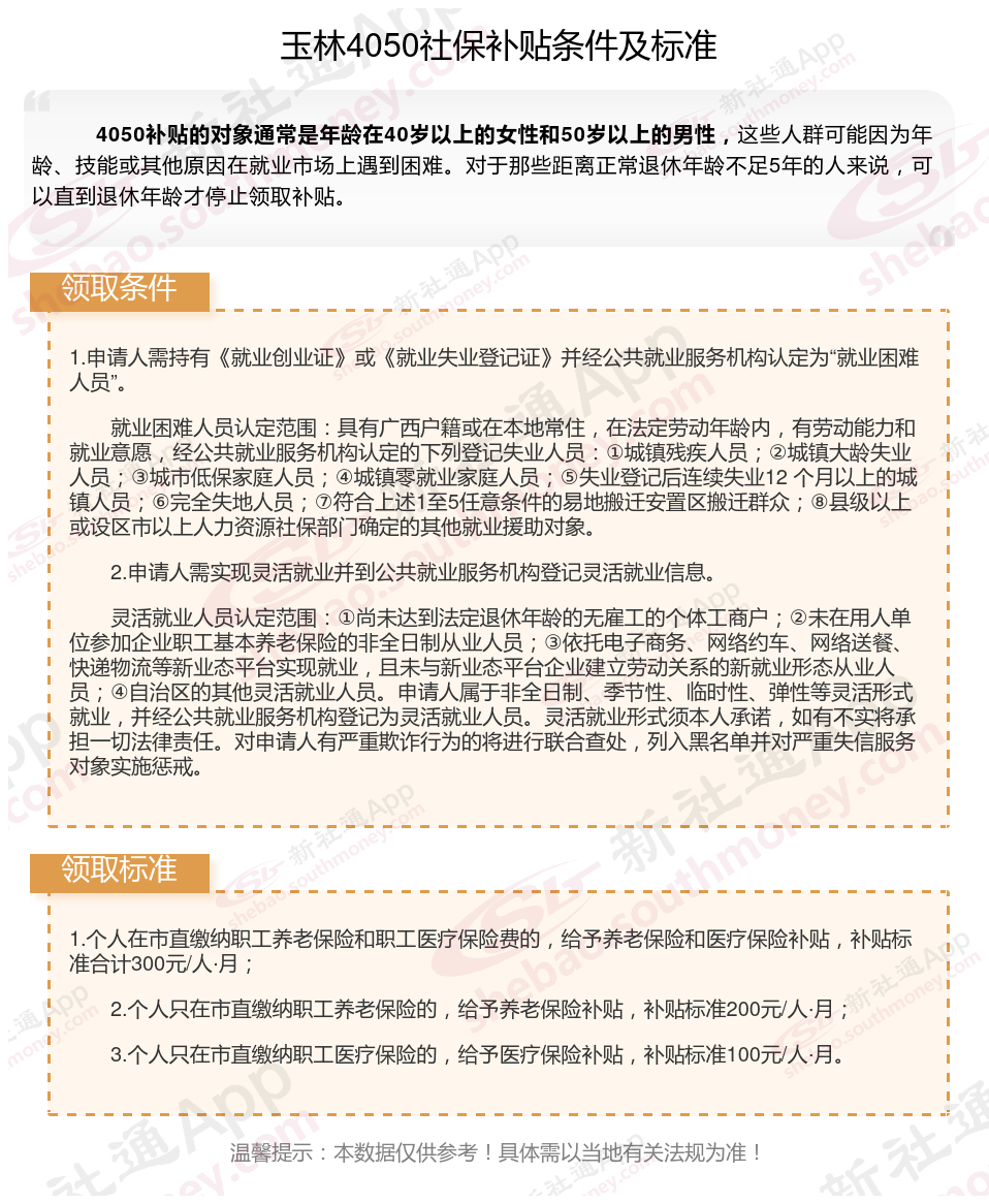 2025玉林4050补贴主要针对的是年龄在40岁以上的女性和50岁以上的男性,这些人群通常因为年龄较大而面临就业困难。