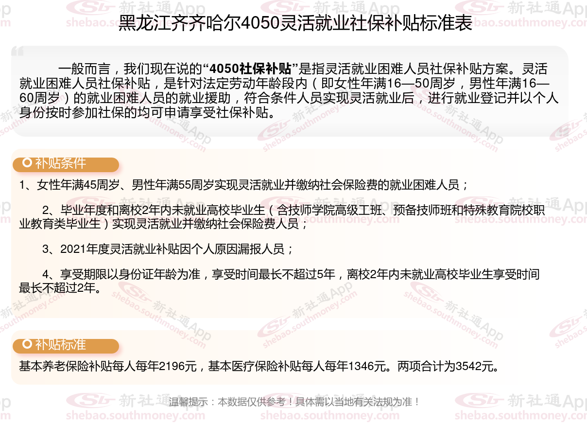 一、2023-2024年黑龙江齐齐哈尔灵活就业4050社保补贴标准和条件是什么