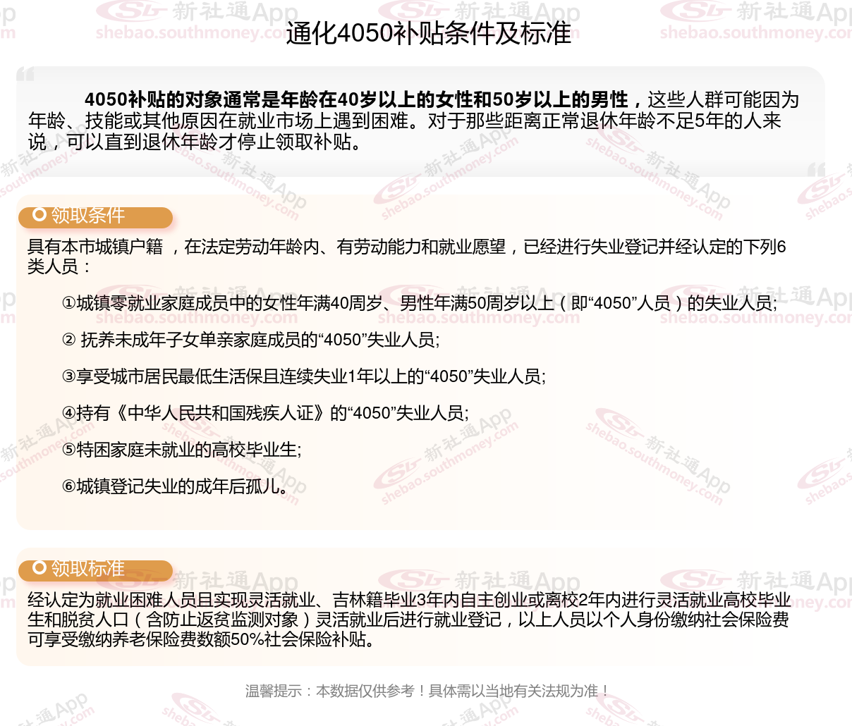 2025通化4050补贴主要针对的是年龄在40岁以上的女性和50岁以上的男性,这些人群通常因为年龄较大而面临就业困难。