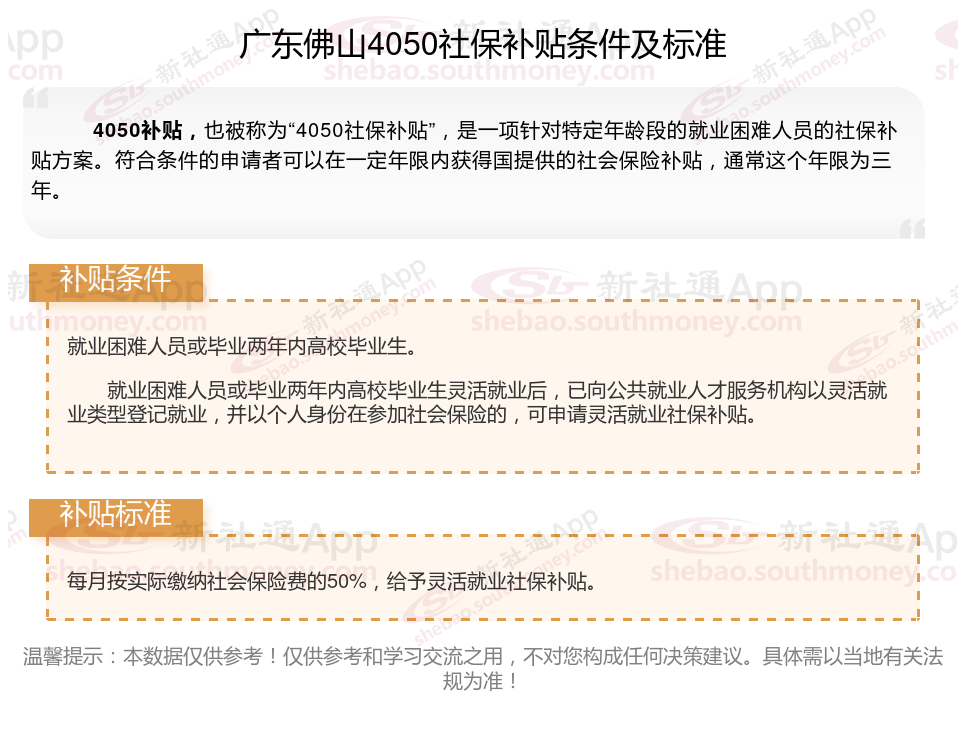 一、广东佛山4050社保补贴标准及条件2023-2024年