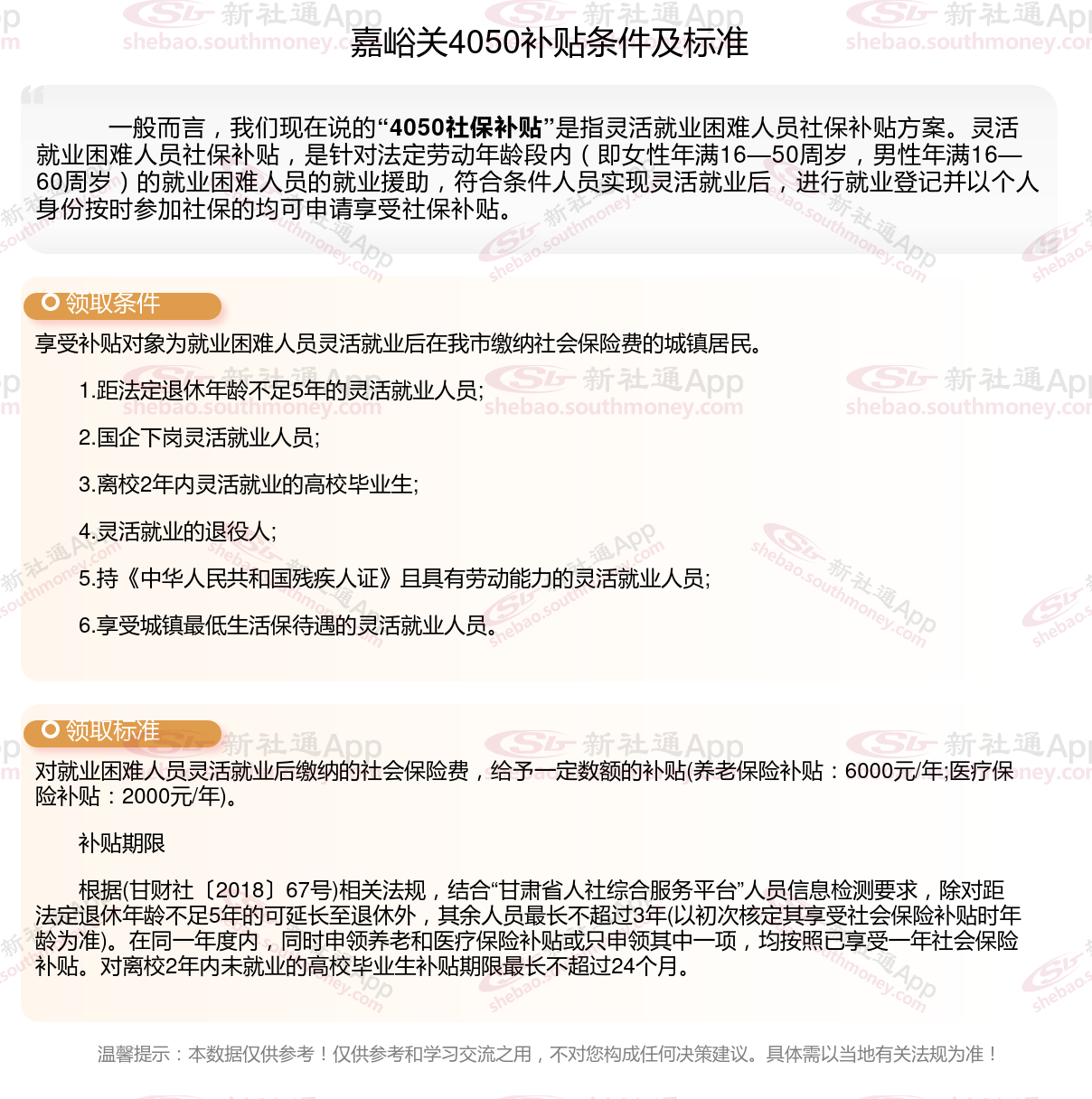二、2023-2024年嘉峪关4050社保补贴标准,最新领取条件来了