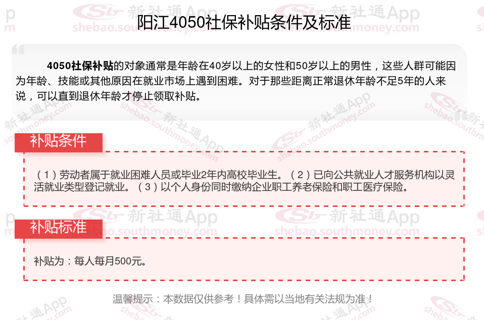 以上就是阳江4050灵活就业困难人员社保补贴的相关内容,欢迎关注新社通/下载新社通APP了解更多五险一金专业资讯。