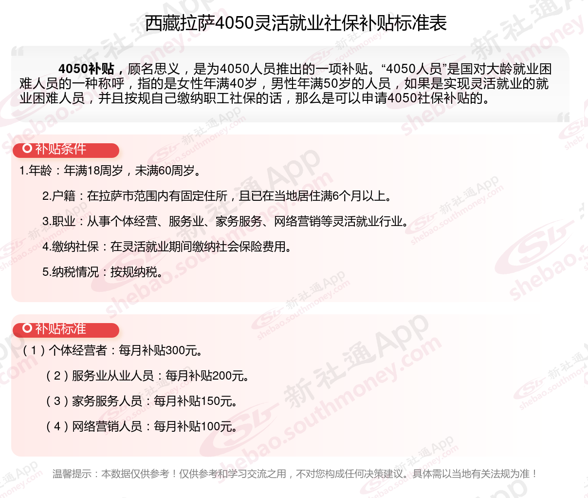 以上就是西藏拉萨4050灵活就业社保补贴的相关内容,欢迎关注新社通/下载新社通APP了解更多五险一金专业资讯。