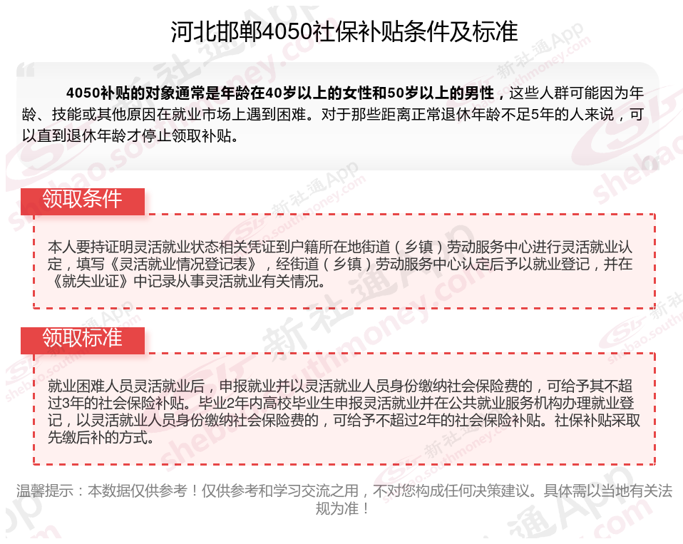 以上就是河北邯郸4050灵活就业社保补贴的相关内容,欢迎关注新社通/下载新社通APP了解更多五险一金专业资讯。