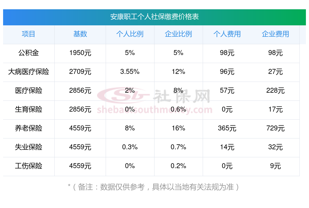安康缴费社保比例一览 社保公司和个人各交多少?下表是2024-2025年安康社保费用明细参考,新社通app-社保缴费查询工具提供的最新数据如下: