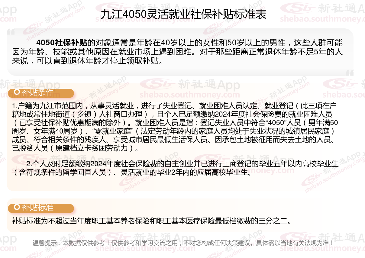 一、九江4050社保补贴标准及条件2023-2024年