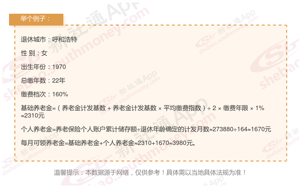 退休城市:呼和浩特,性别:女,出生年份:1970,总缴年数22年,缴费档次:160%,新社通app养老金计算器所得: