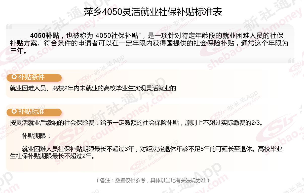 一、萍乡4050社保补贴标准及条件2023-2024年