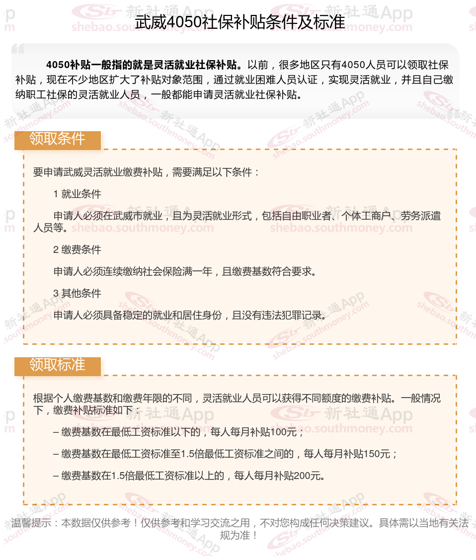 二、武威灵活就业4050社保补贴标准及条件是什么