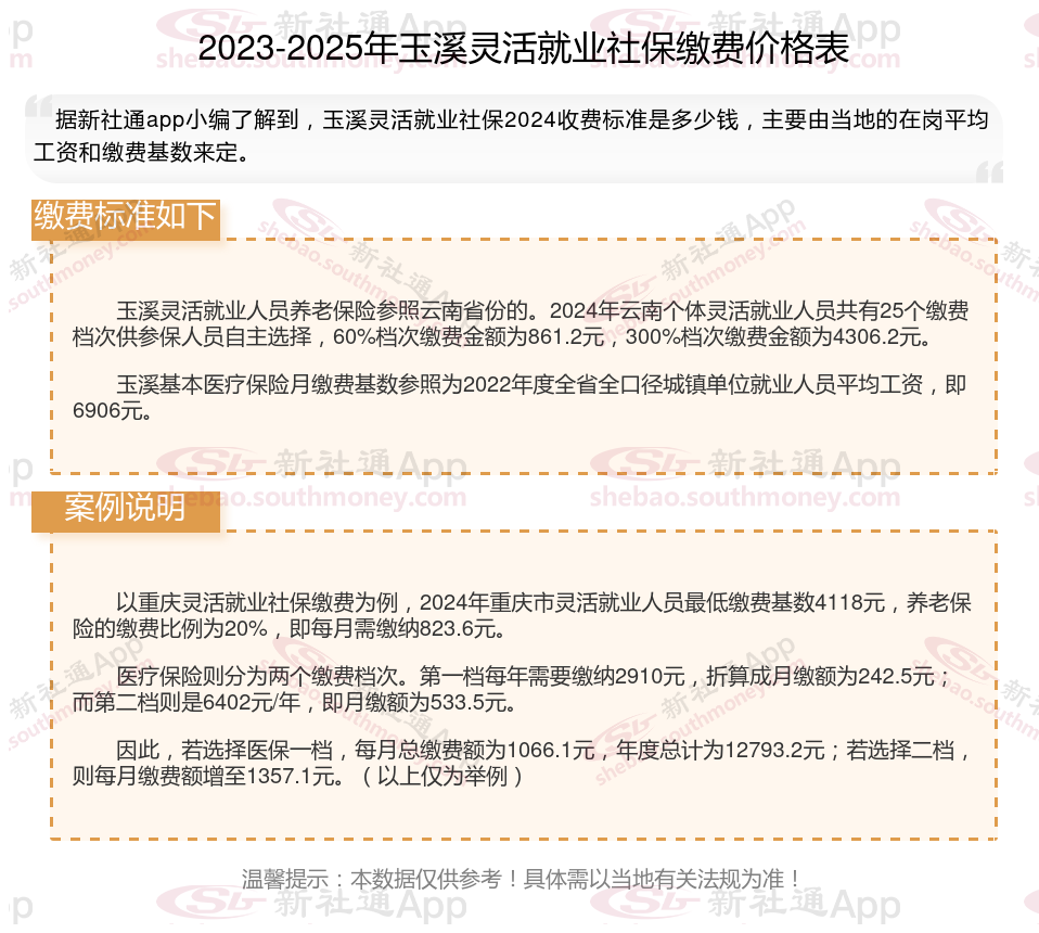 据新社通app数据显示,玉溪灵活就业养老保险缴费基数2024-2025年最新标准如下: