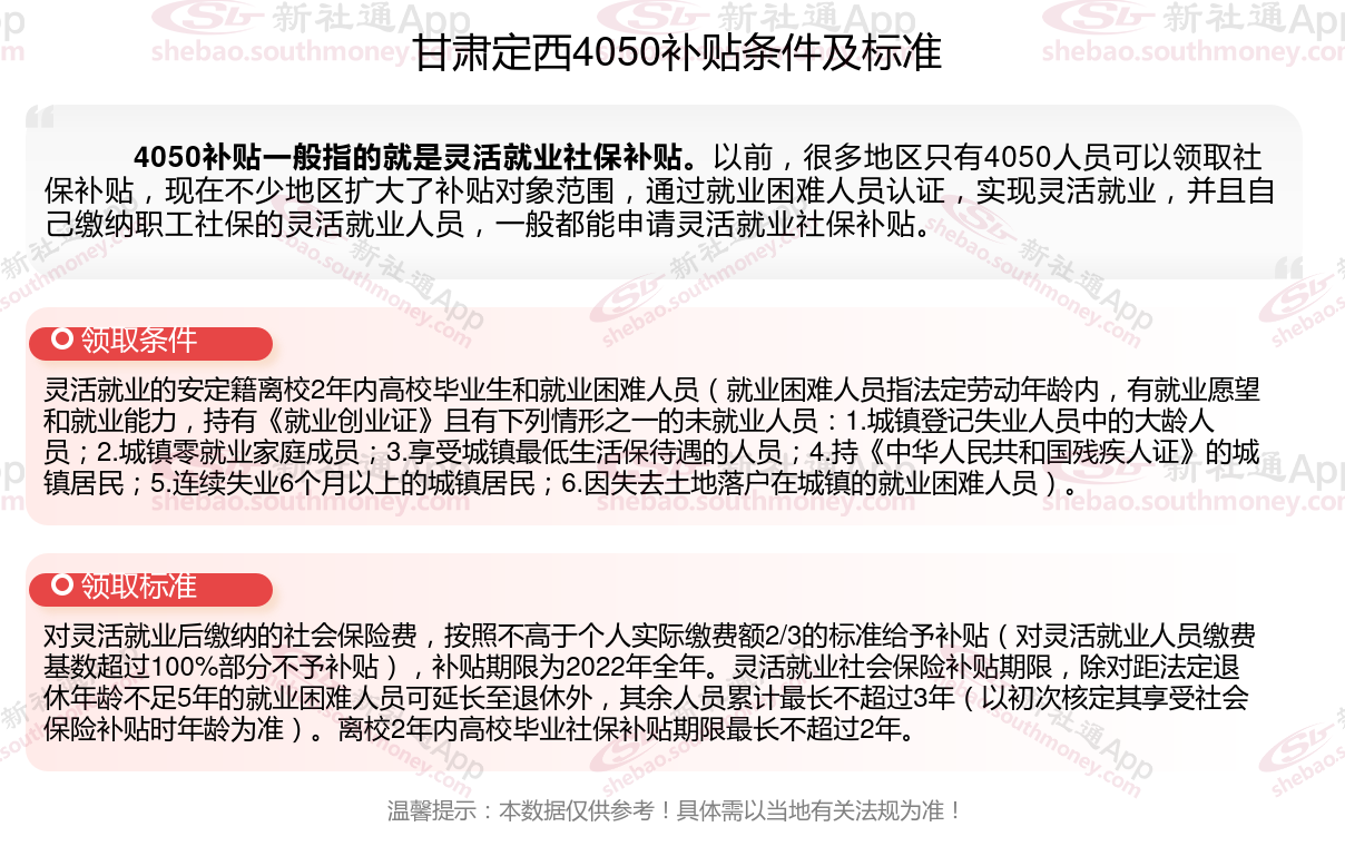 2025甘肃定西灵活就业4050社保补贴是一项面向特定年龄段的就业困难人群的社会保险补贴。