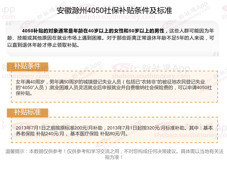 安徽滁州4050灵活就业社保补贴标准如何?“4050补贴”主要是针对大龄就业困难人群的社保补贴,申请条件包括年龄、就业困难、灵活就业并自费缴纳社保,需要持有失业登记证,不同地区可能有细微差别,比如农村户口的限制。那么安徽滁州4050灵活就业社保补贴标准是多少钱?安徽滁州4050社保补贴条件是什么?接下来随新社通APP小编了解一下安徽滁州4050灵活就业社保补贴标准最新资讯。